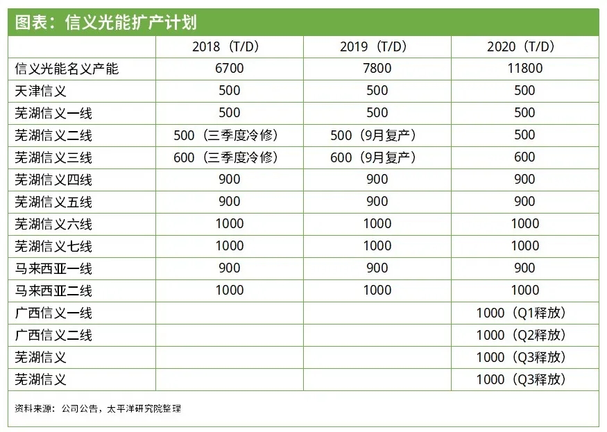 信義光能產(chǎn)能擴張計劃。信義現(xiàn)有產(chǎn)能主要分布在天津、蕪湖以及馬來西亞,目前產(chǎn)能分別為500T/D、5400T/D以及1900T/D。2020年公司預(yù)計將在廣西、蕪湖各擴建2條1000T/D產(chǎn)線,屆時公司產(chǎn)能將達到11800T/D。