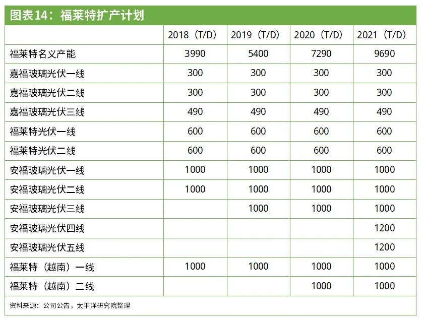 福萊特產(chǎn)能擴張計劃。福萊特現(xiàn)有產(chǎn)能主要分布在嘉興、鳳陽以及越南,目前產(chǎn)能分別為2290T/D、3000T/D以及1000T/D。2020年公司預(yù)計將在越南擴建1條1000T/D產(chǎn)線,2021年將在安徽鳳陽擴建2條1200T/D產(chǎn)線,屆時2020年公司產(chǎn)能預(yù)計為7290T/D,2021年將達到9690T/D。