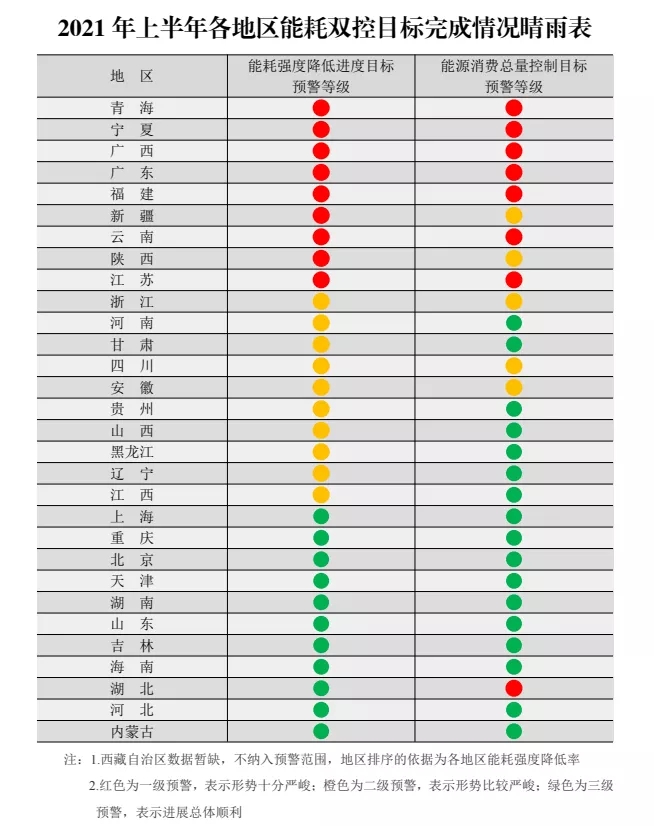 所謂“能耗雙控”政策,是指能源消費(fèi)強(qiáng)度和總量雙控的相關(guān)政策。今年以來(lái),對(duì)“能耗雙控”的考核一直比較嚴(yán)格。國(guó)家發(fā)展和改革委員會(huì)印發(fā)的《2021年上半年各地區(qū)能耗雙控目標(biāo)完成情況晴雨表》顯示,在能耗強(qiáng)度降低方面,青海、寧夏、廣西、廣東、福建、新疆、云南、陜西、江蘇9個(gè)?。▍^(qū))上半年能耗強(qiáng)度不降反升,被列為紅色的一級(jí)預(yù)警;在能源消費(fèi)總量控制方面,青海、寧夏、廣西、廣東、福建、云南、江蘇、湖北8個(gè)省(區(qū))被列為紅色的一級(jí)預(yù)警。